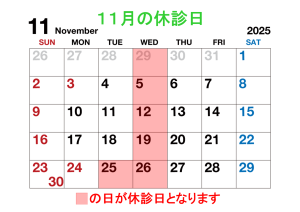 11月の休診日のお知らせ 2025.10.30 整骨院からのお知らせ 11月は、 ●毎週水曜日 ●25日(火) を休診とさせていただきます。 その他の日は、通常どおり受付しておりますのでよろしくお願いいたします。 SHARE US PREV お知らせ一覧